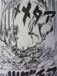 “波紋”をまとった拳で岩の上にいるカエルを殴ったときの擬音。
